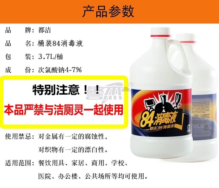 产品名称 : 都洁84消毒液3.7L*4桶/箱 大桶装 85消毒水 都洁消毒液 大桶消毒水 整箱装