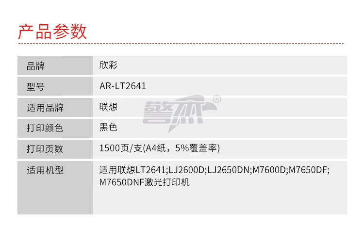 产品名称 : 欣彩AR-LT2641粉盒 大众版 适用联想LT2641 LJ2600D LJ2650DN M7600D M7650DF M7650DNF激光打印机