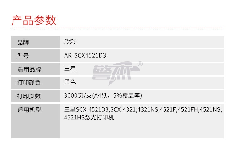 产品名称 : 欣彩 SCX-4521D3 易加粉 AR-SCX4521D3硒鼓 适用三星Samsung SCX-4321 4521F