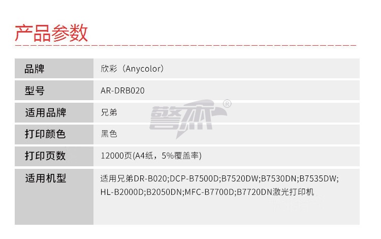 产品名称 : 欣彩AR-DRB020鼓架 专业版硒鼓组件 适用兄弟DR-B020 DCP-B7500D B7520DW B7530DN B7535DW激光打印机