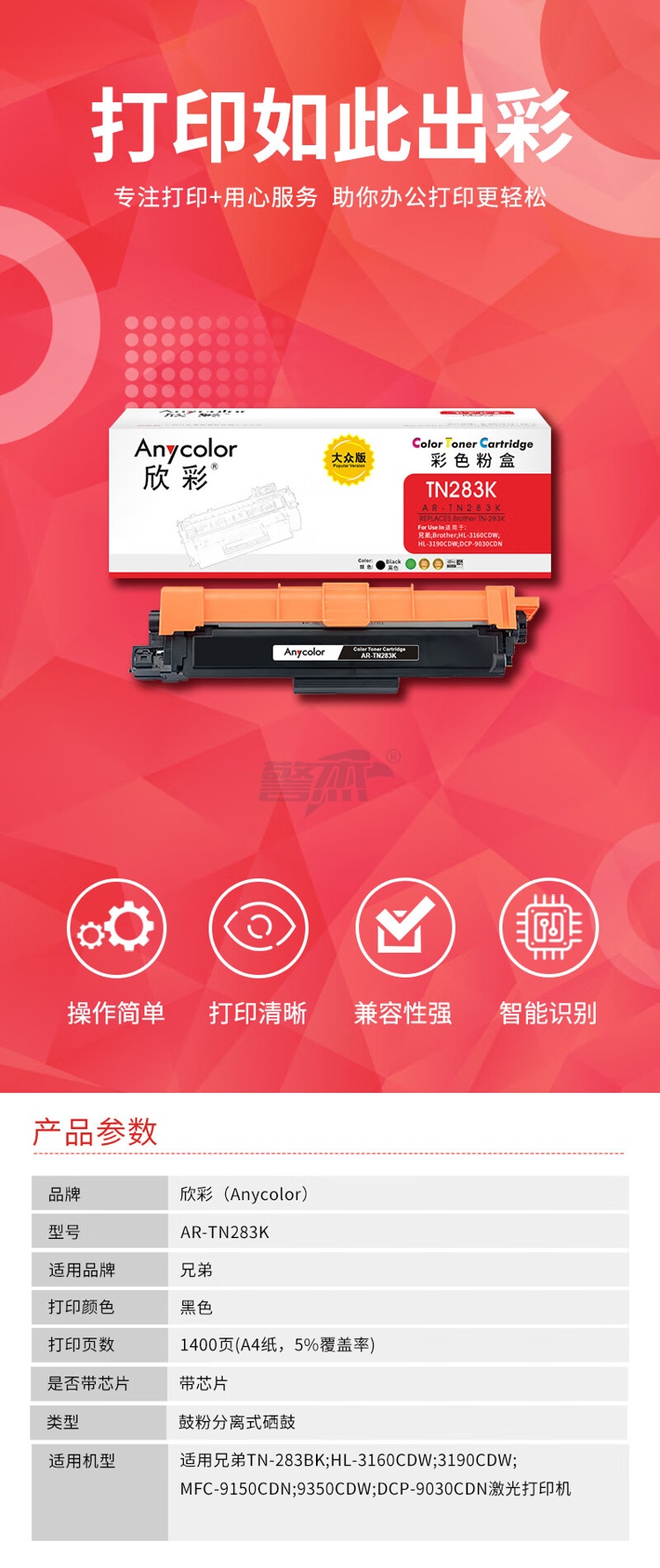 产品名称 : 欣彩AR-TN283K黑色粉盒 大众版墨粉盒 适用兄弟TN-283BK HL-3160CDW 3190CDW MFC-9150CDN 9350CDW激光打印机