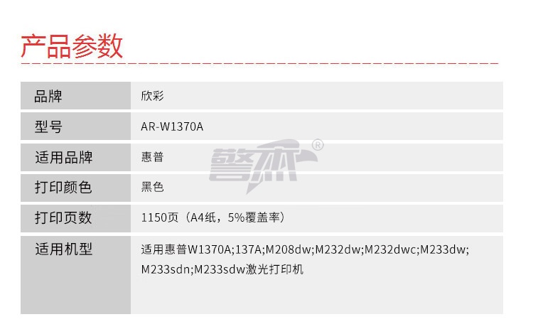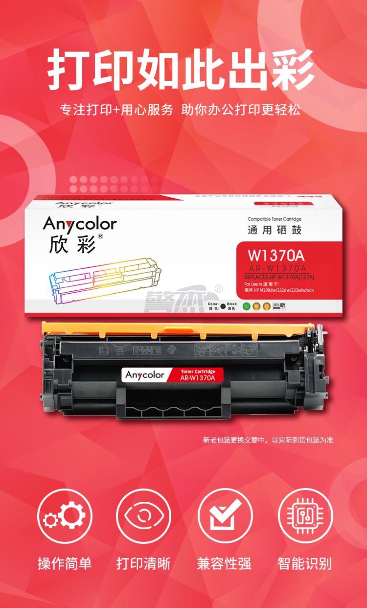 产品名称 : 欣彩AR-W1370A硒鼓 带芯片 适用惠普W1370A 137A M208dw M232dw M232dwc M233dw激光打印机