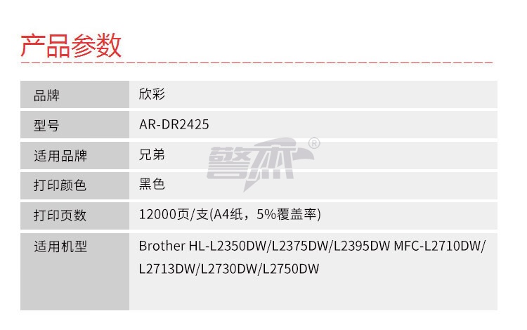产品名称 : 欣彩AR-DR2425鼓架 12K硒鼓组件DR-2425 适用兄弟HL-L2350DW L2375DW L2395DW MFC-L2710DW L2713DW澳洲版