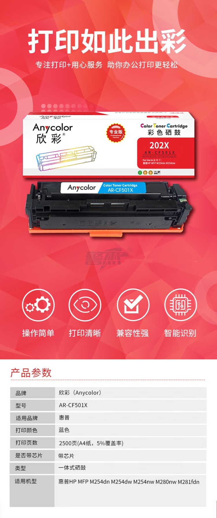 产品名称 : 欣彩AR-CF501X硒鼓蓝(青)色 CF501A/X 202X大容量专业版 适用惠普M254dn M280nw M281fdn 单位:支 起订量1支