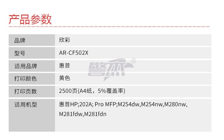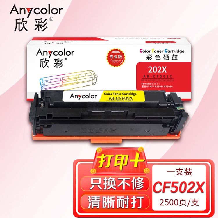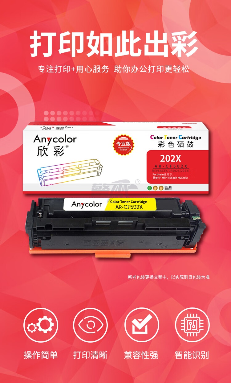 产品名称 : 欣彩AR-CF502X硒鼓黄色 CF502A/X 202X大容量专业版 适用惠普M254dn M280nw M281fdn 单位:支 起订量1支
