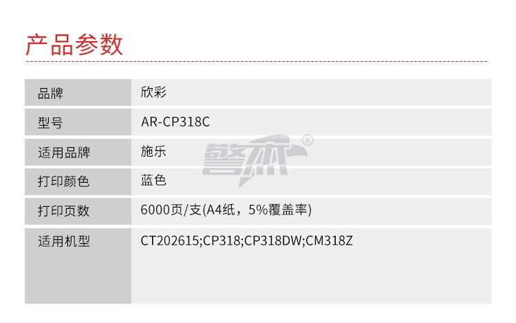 产品名称 : 欣彩AR-CP318C蓝色粉盒 CT202615墨粉筒专业版 适用施乐CP318 CP318DW CM318Z