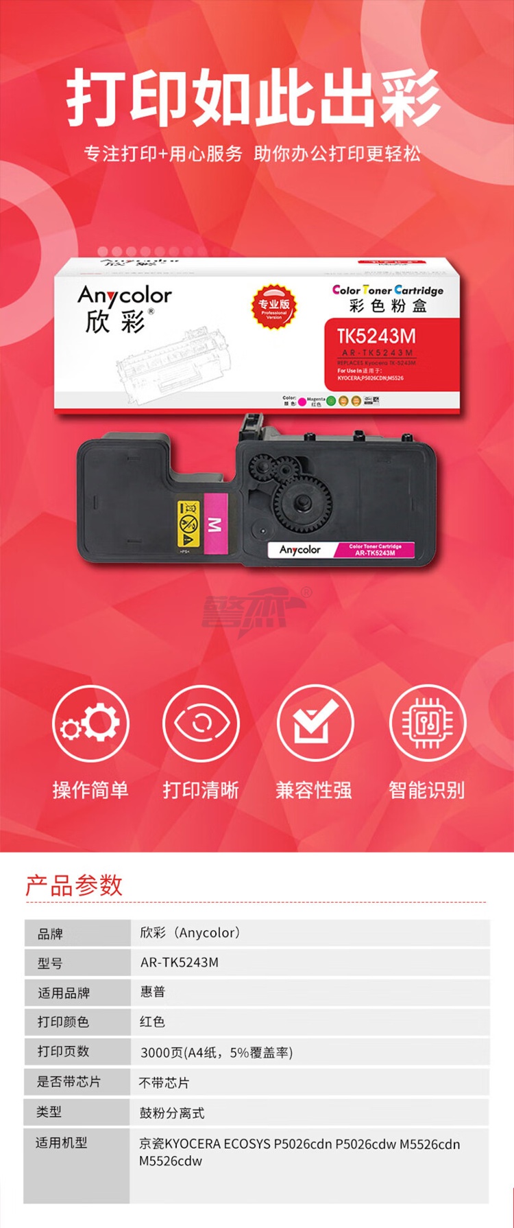 产品名称 : 欣彩AR-TK5243M红色粉盒 TK-5243M墨粉专业版 适用京瓷Kyocera ECOSYS P5026cdn P5026cdw M5526cdn M5526cdw