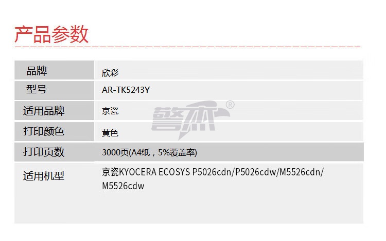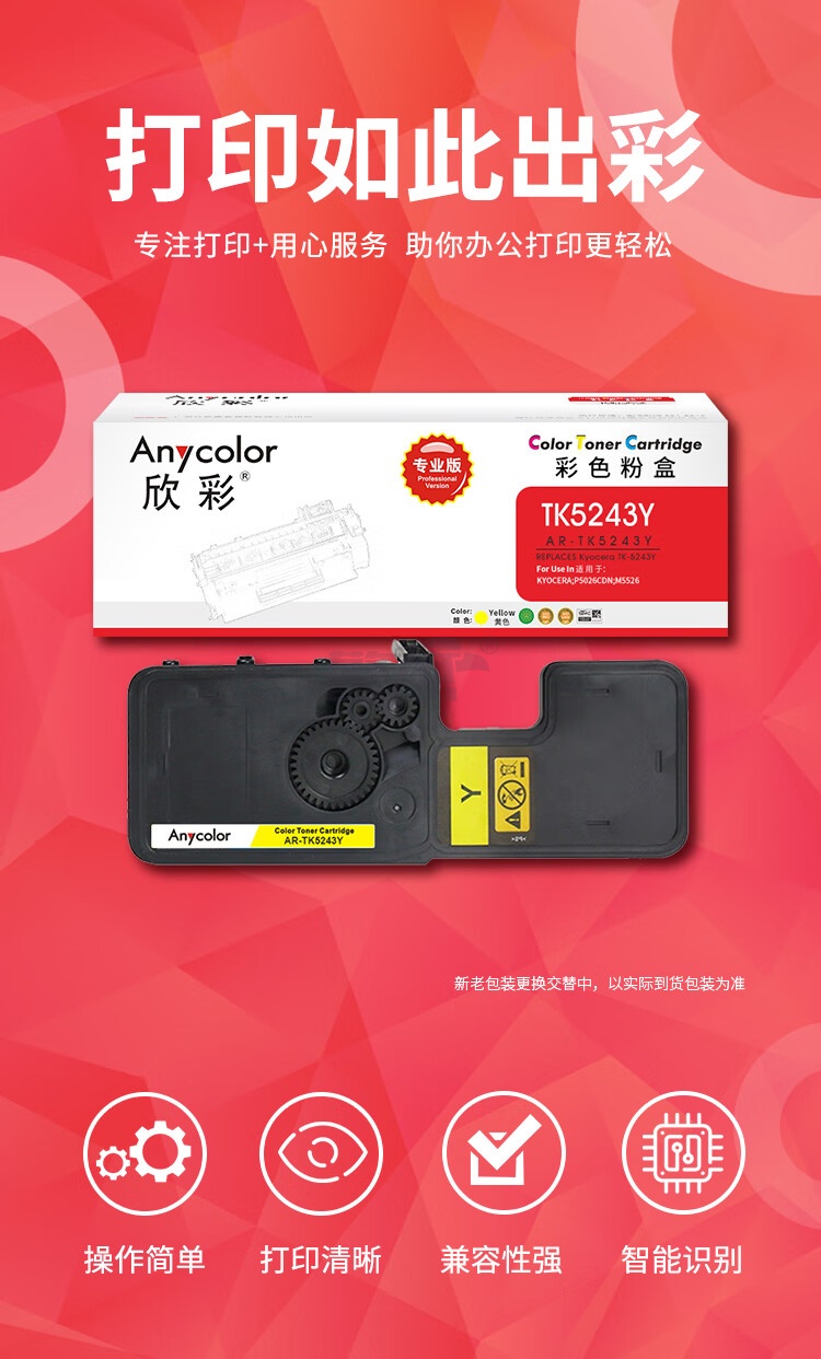 产品名称 : 欣彩AR-TK5243Y黄色粉盒 TK-5243Y墨粉专业版 适用京瓷KYOCERA ECOSYS P5026cdn P5026cdw M5526cdn M5526cdw
