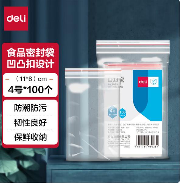 产品名称 : 得力3023自封袋(透明)-4号(100个/包)110x80mm0.04mm