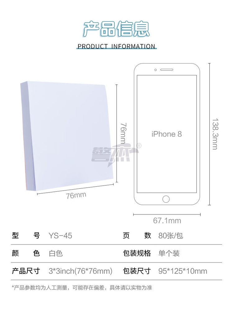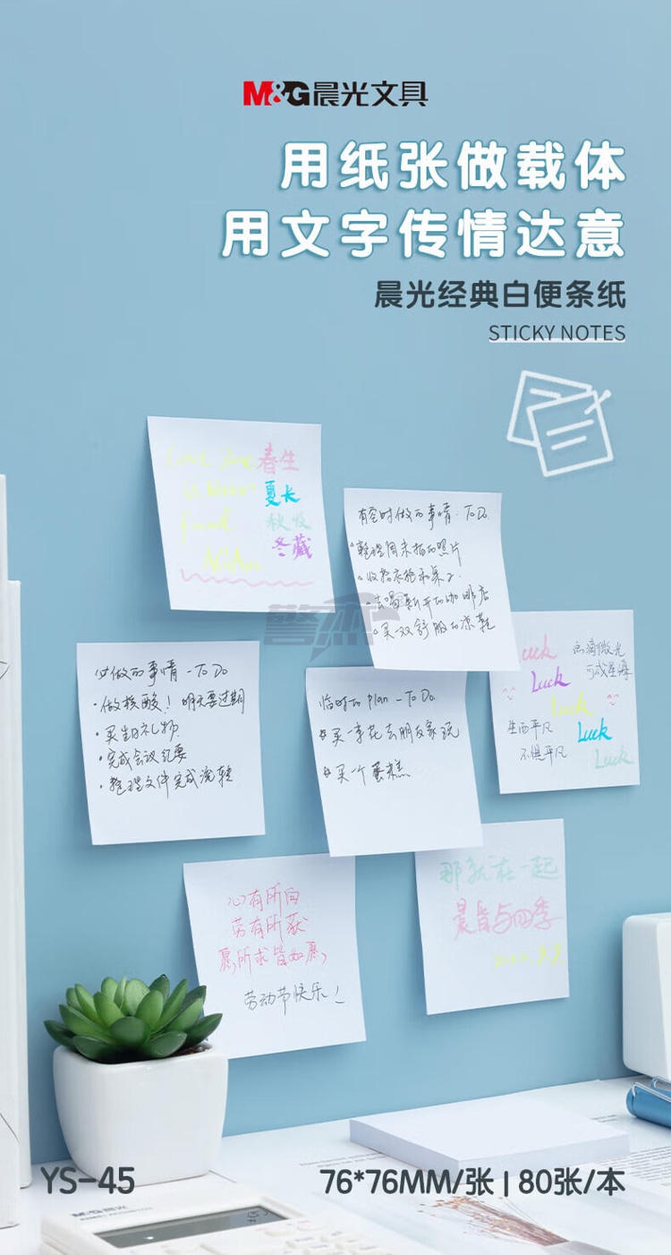 产品名称 : 晨光(M&G) 白色80张便利贴 粘性标签贴留言贴 76*76mm记事贴优事贴便签本子 单本装YS-45
