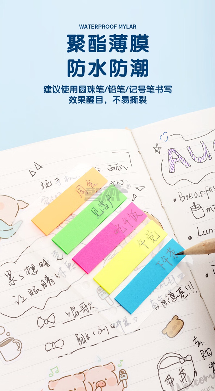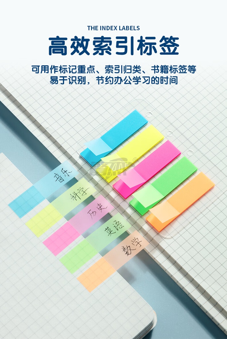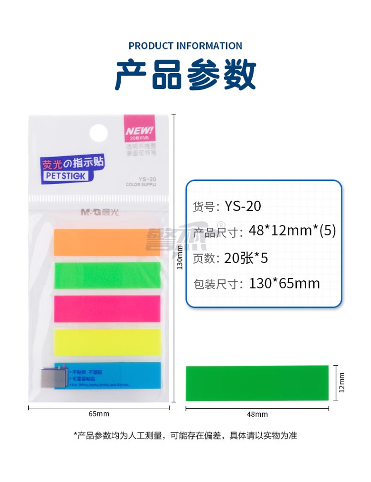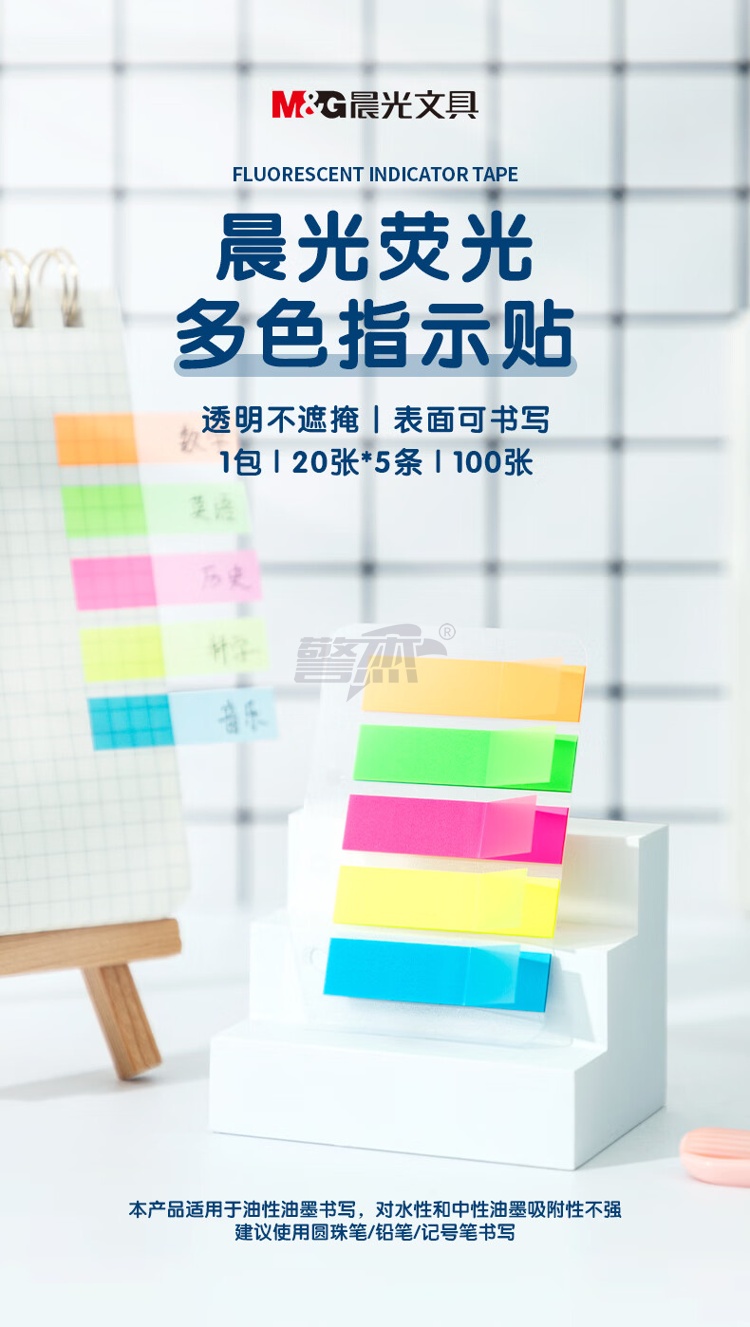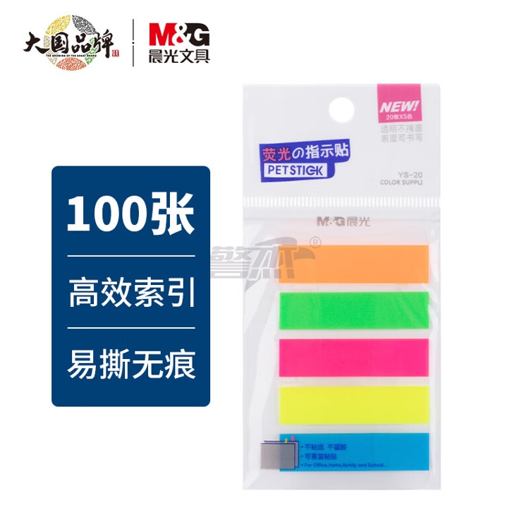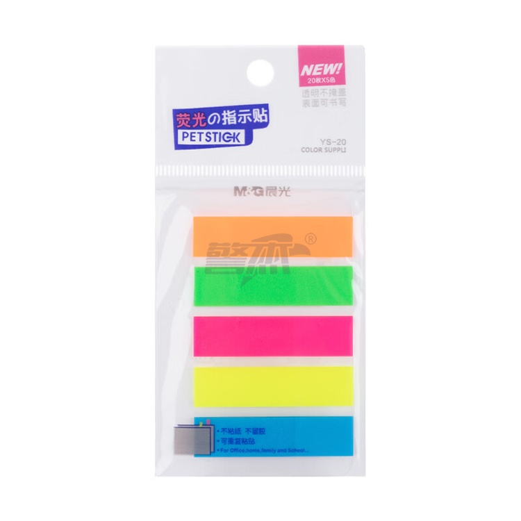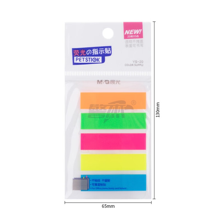 产品名称 : 晨光(M&G)文具5色100枚PET荧光便利贴 粘性标签贴姓名贴 记事留言贴优事贴便签本子 20页/条YS-20