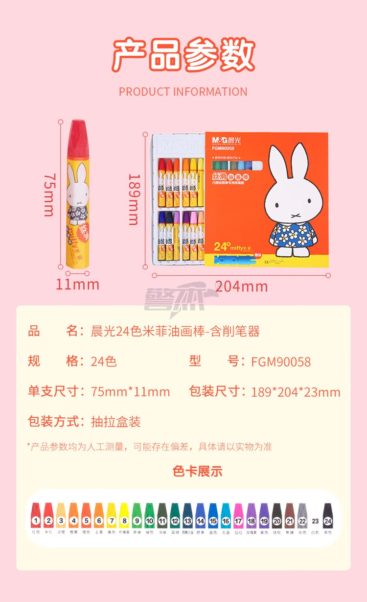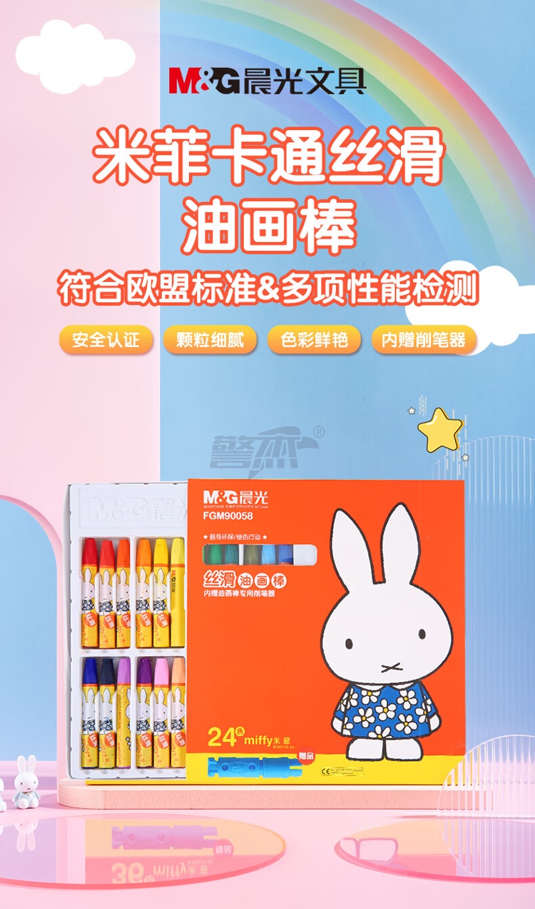 产品名称 : 晨光(M&G)文具24色丝滑六角油画棒蜡笔 欧盟安全配方 儿童涂鸦笔 米菲系列油性蜡笔FGM90058