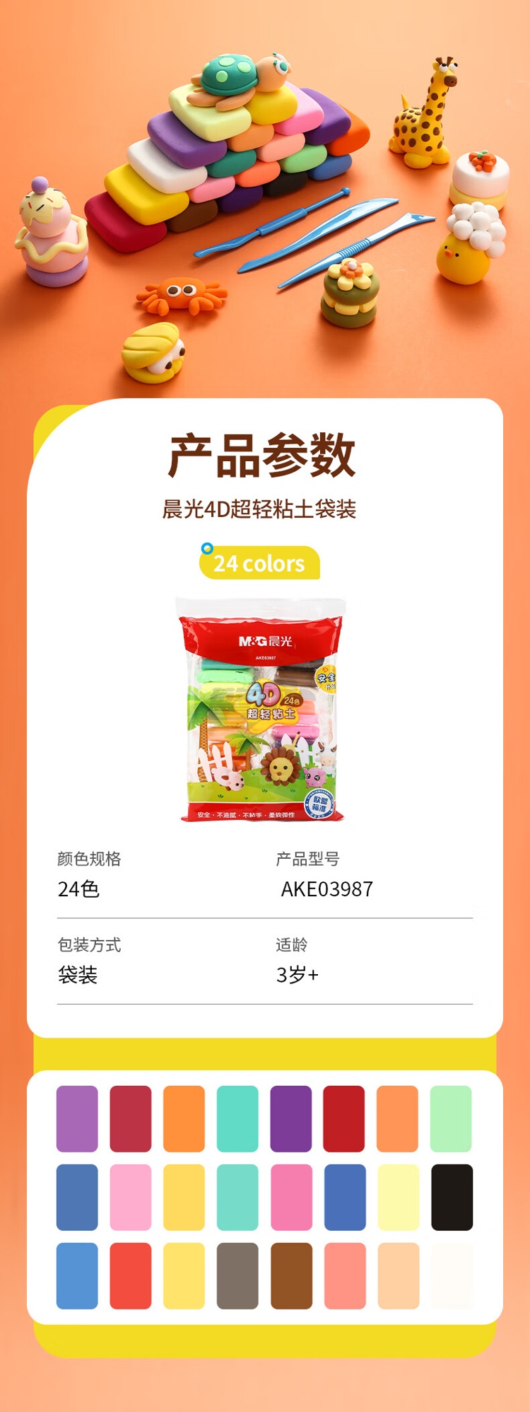 产品名称 : 晨光(M&G) 24色超轻粘土 彩泥黏土橡皮泥4D 儿童手工DIY玩具 袋装AKE03987