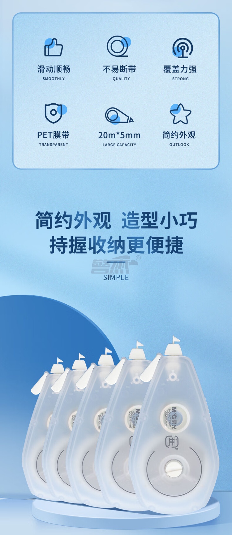 产品名称 : 晨光(M&G)文具20m*5mm简约修正带 学生不易断带涂改带 無系列顺滑改正带 单支装ACT59801