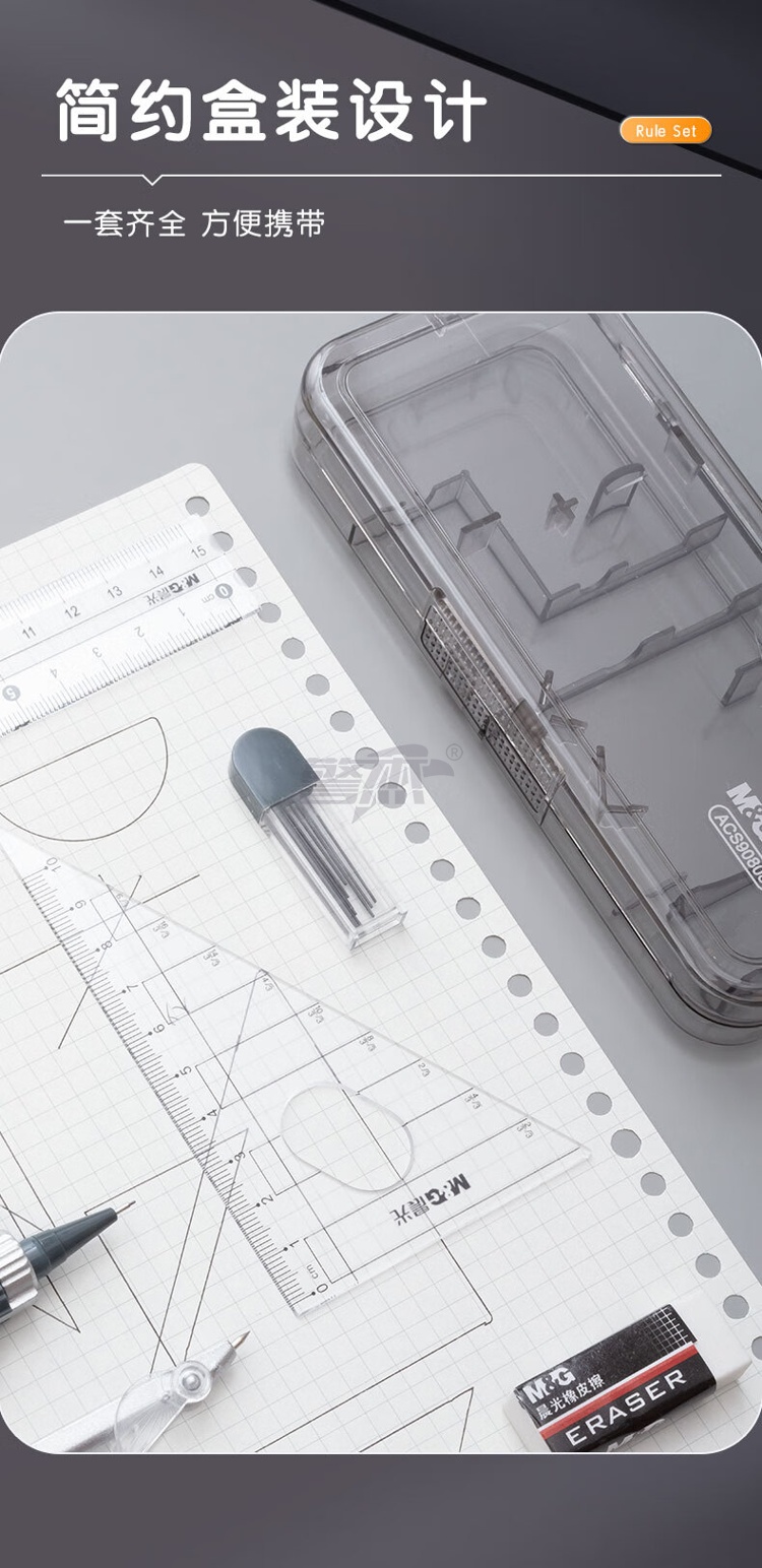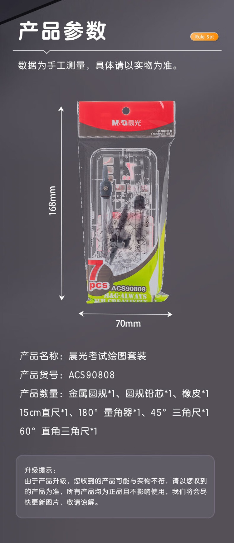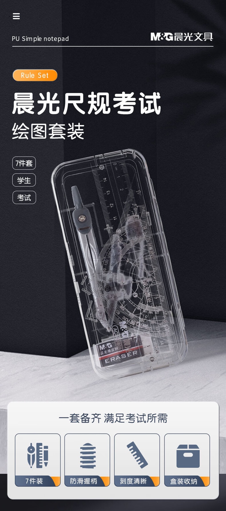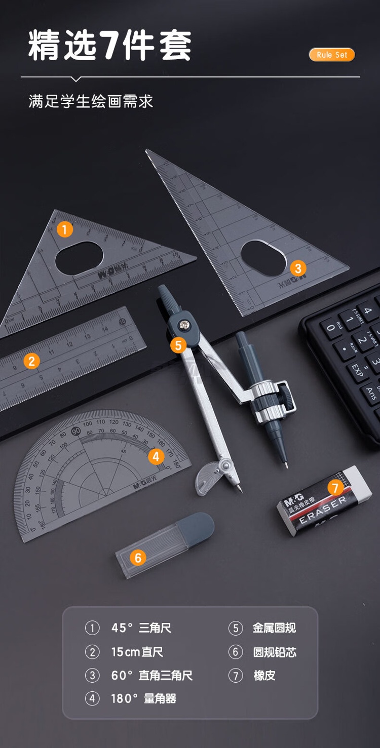 产品名称 : 晨光(M&G)文具学生考试绘图套装(圆规+橡皮+直尺+三角尺/尺子+量角器)学习用品组合装 7件套ACS90808
