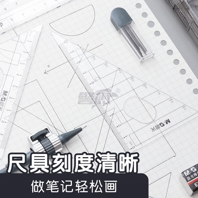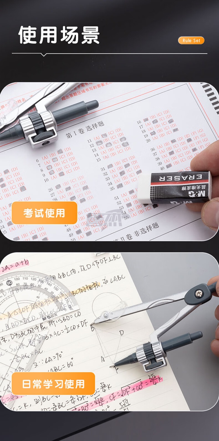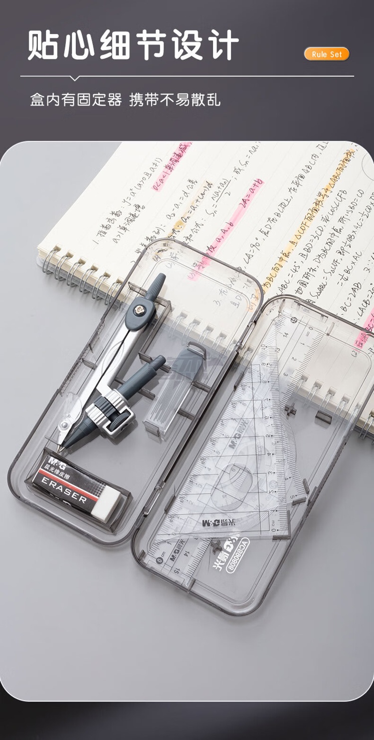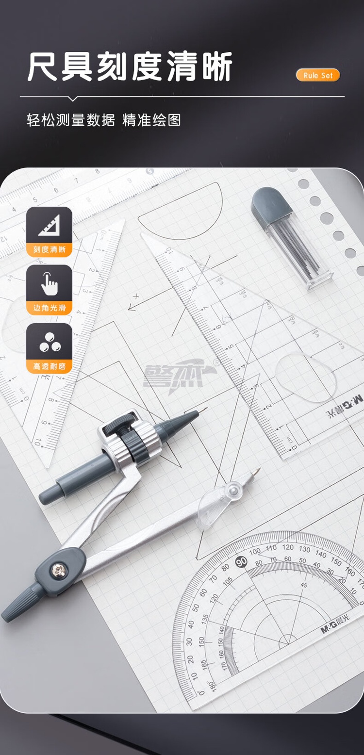 产品名称 : 晨光(M&G)文具学生考试绘图套装(圆规+橡皮+直尺+三角尺/尺子+量角器)学习用品组合装 7件套ACS90808