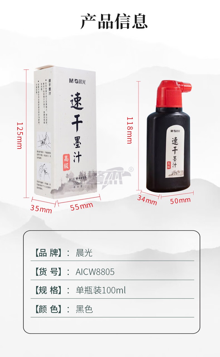 产品名称 : 晨光(M&G)文具100ml高级速干墨汁 创作墨汁 文房四宝学生书法绘画墨水 单瓶装AICW8805