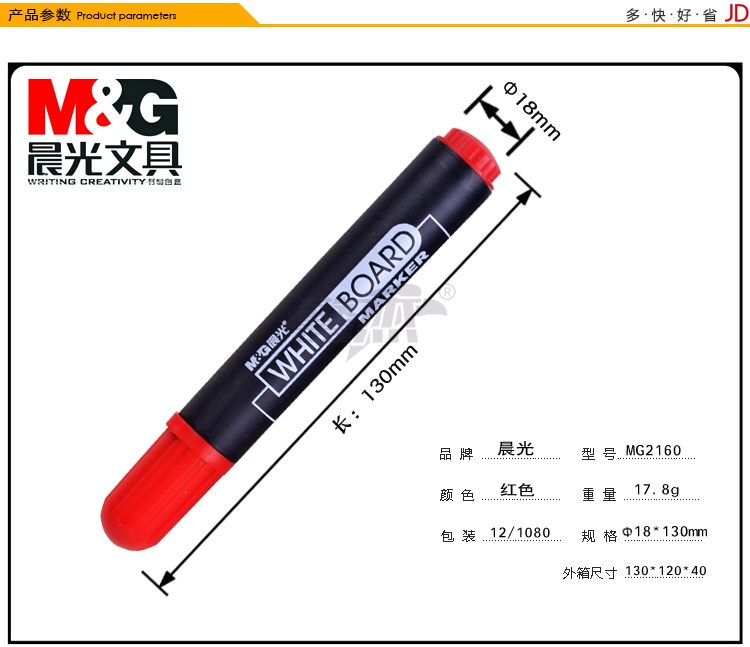 产品名称 : 晨光(M&G) 红色可擦记号笔 单头办公会议笔 易擦物流记号笔 12支/盒MG2160