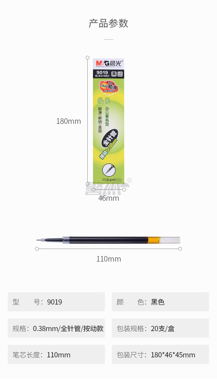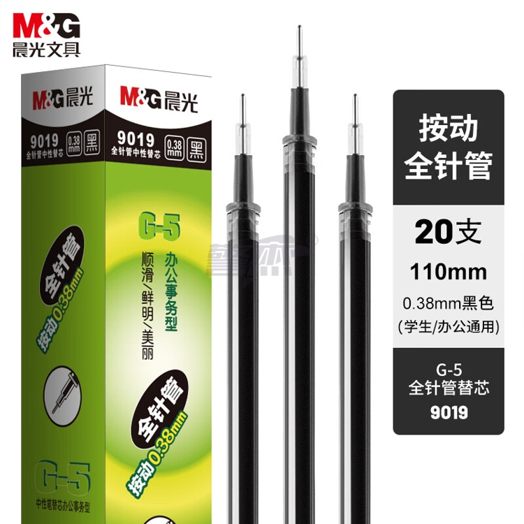产品名称 : 晨光(M&G) 0.38mm黑色中性笔替芯 经典按动款签字笔替芯 G-5全针管系列水笔芯 20支/盒9019A