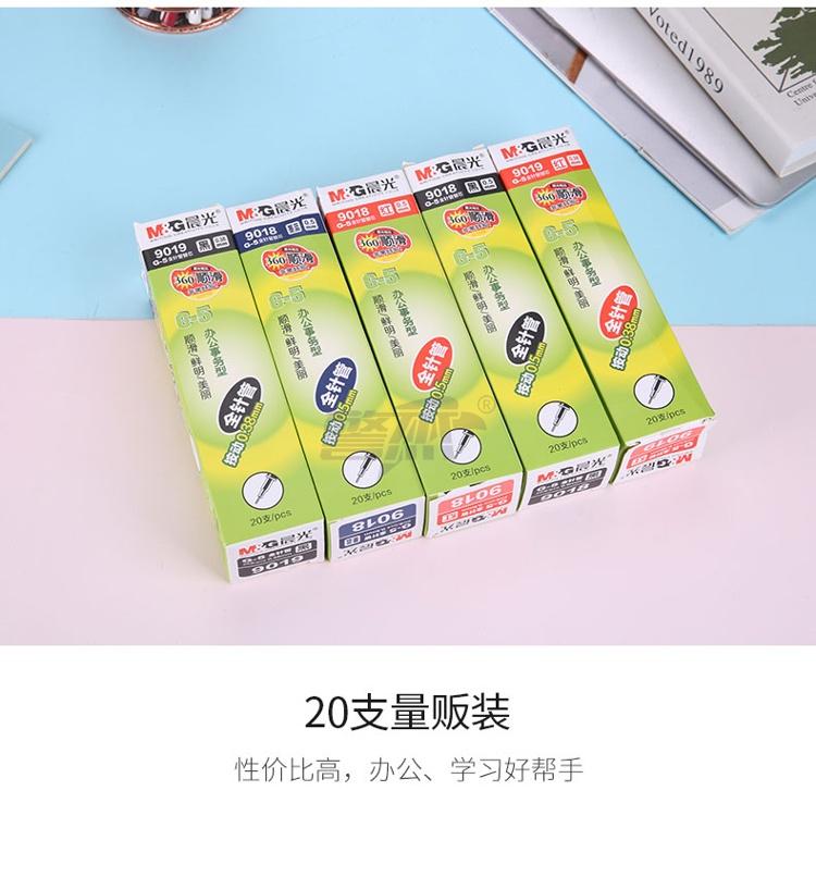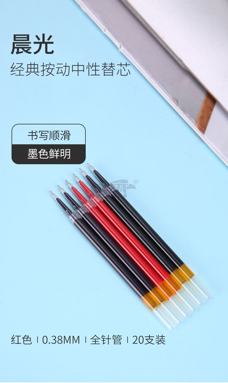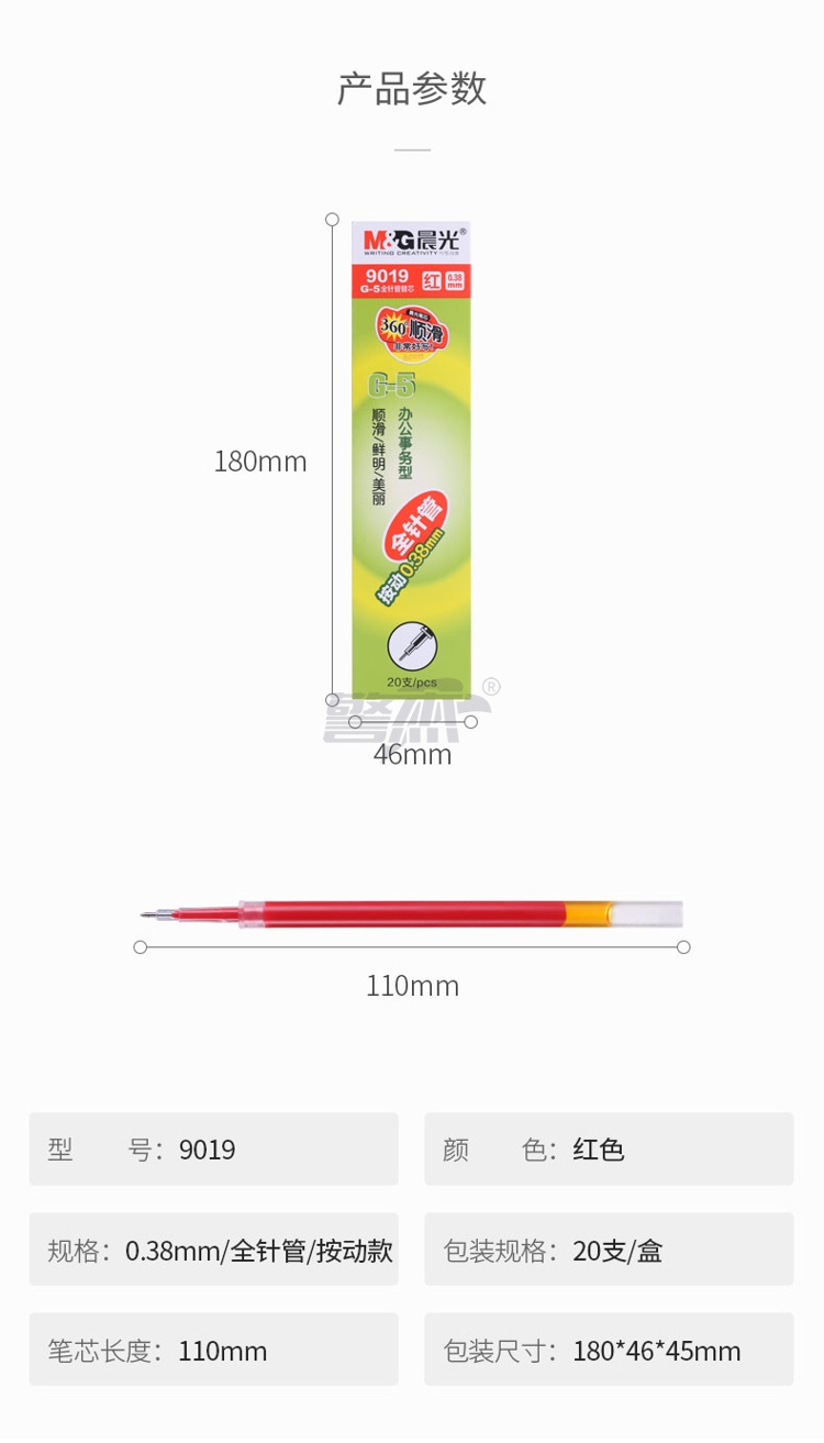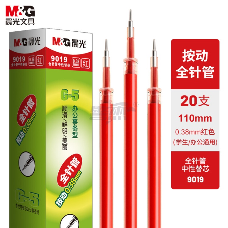 产品名称 : 晨光(M&G) 0.38mm红色中性笔替芯 经典按动款签字笔替芯 G-5全针管系列水笔芯 20支/盒9019C