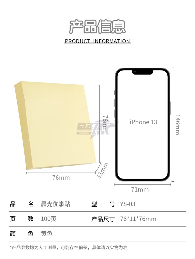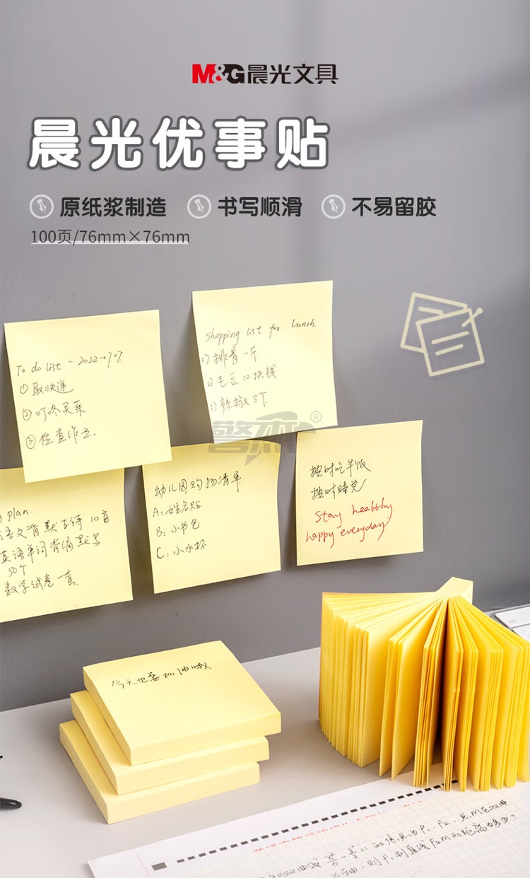 产品名称 : 晨光(M&G) 100张黄色便利贴 76*76mm便签纸n次贴便签贴 记事贴留言贴记事本子 办公用品 YS-03