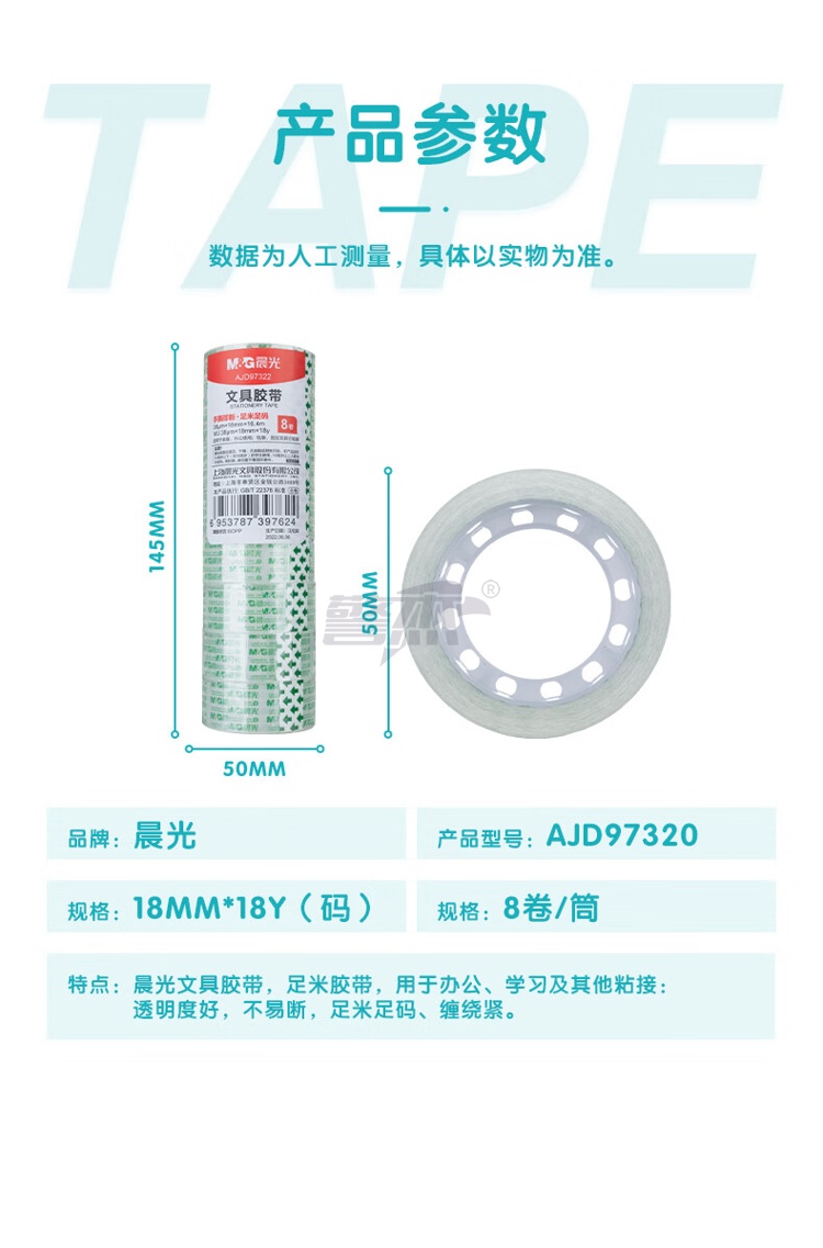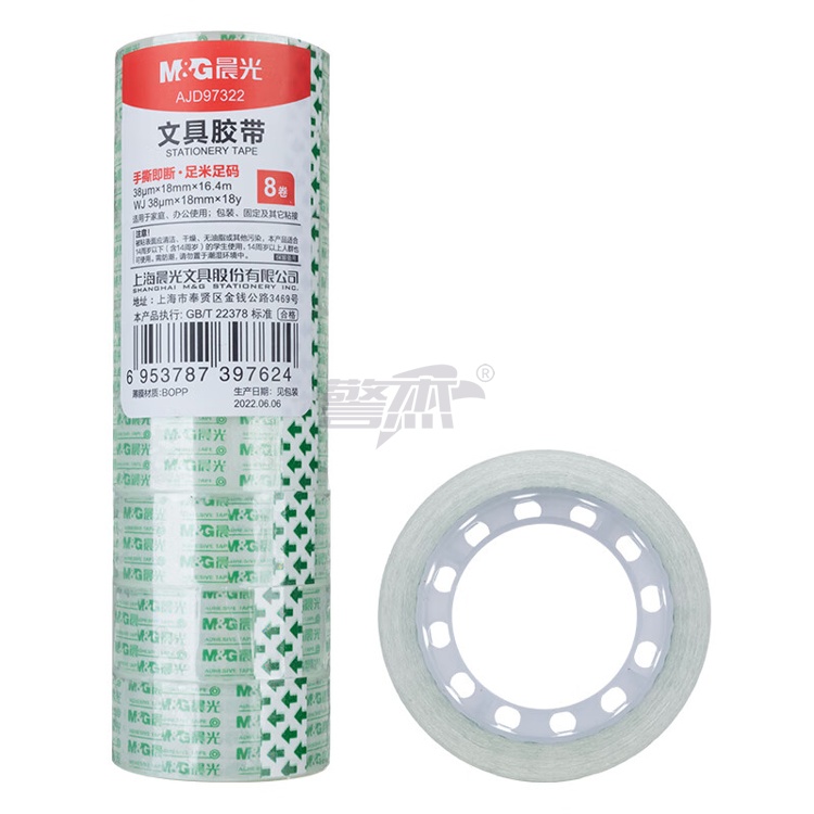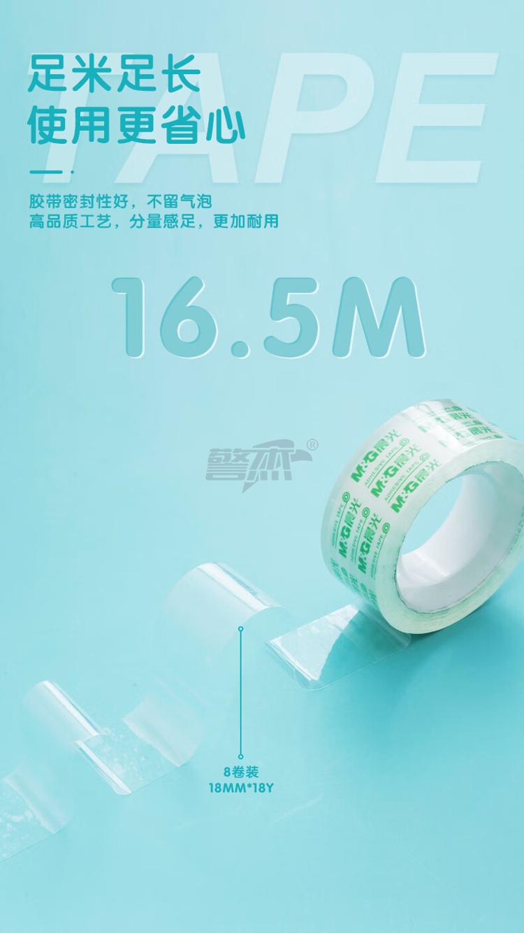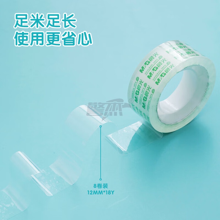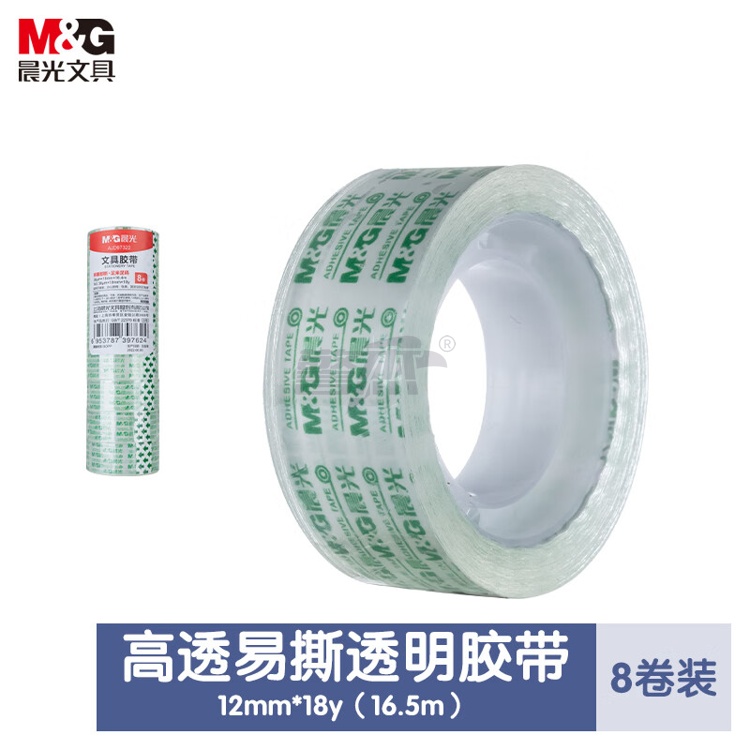 产品名称 : 晨光(M&G)文具透明胶带 高透易撕小胶带 学生手工胶布18mm*18y(16.5米/卷) 8卷装AJD97322