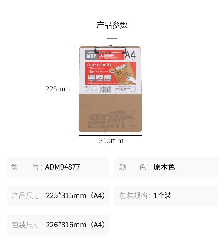产品名称 : 晨光(M&G)文具A4原木色纤维板书写板夹 记事夹文件夹 写字垫板 单个装ADM94877