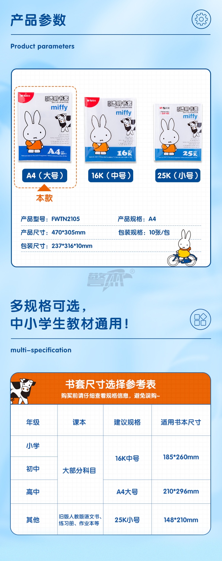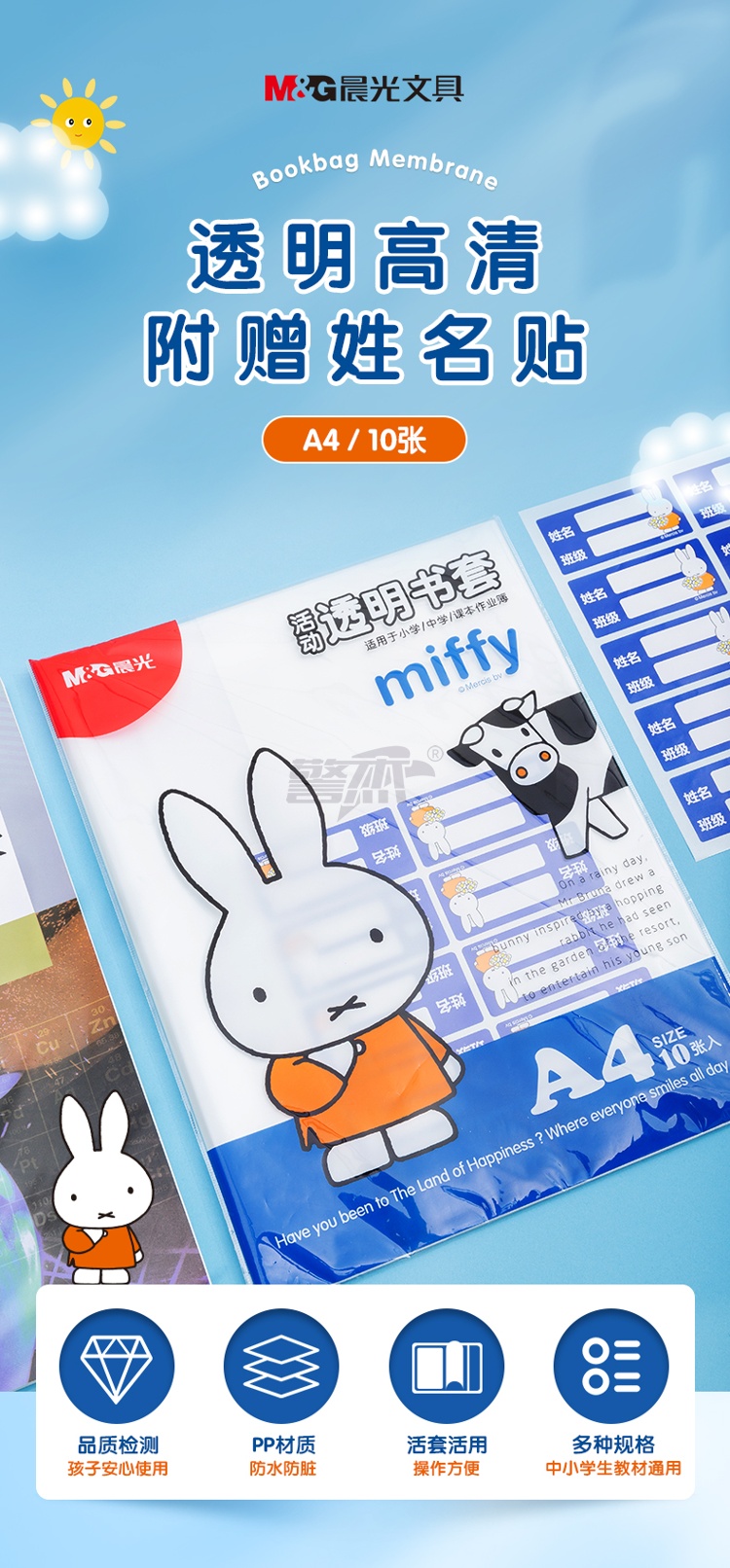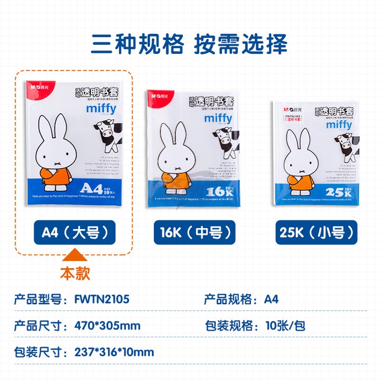 产品名称 : 晨光(M&G)文具A4/10张米菲透明防滑书套 小号包书皮包书膜 CPP材质开学文具(带姓名贴)FWTN2105