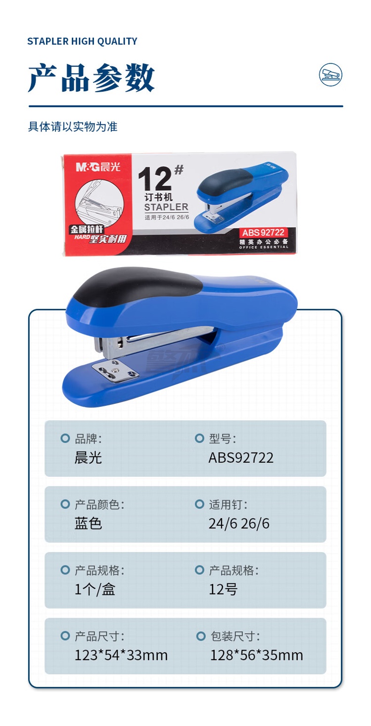 产品名称 : 晨光(M&G)文具12#订书机 耐用便携订书器 办公用品 蓝色单个装ABS92722