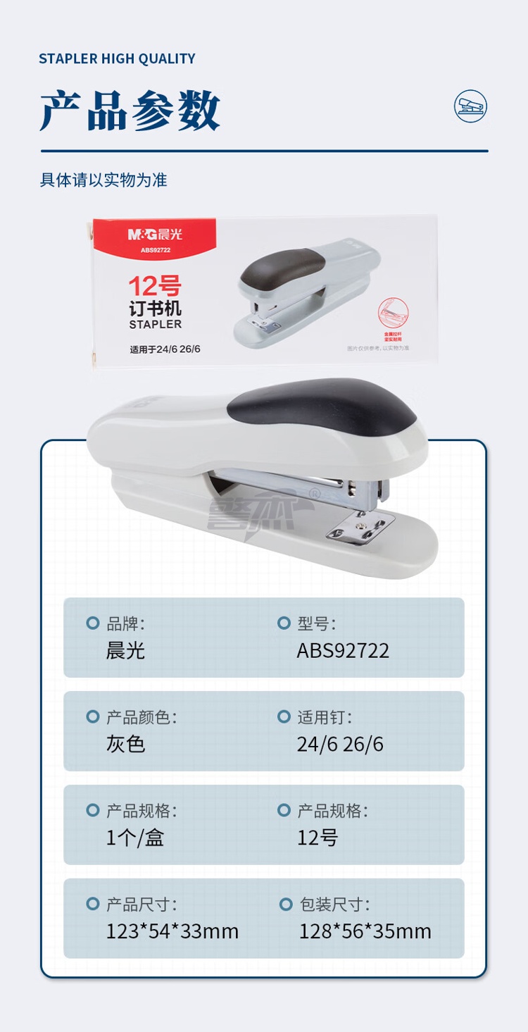 产品名称 : 晨光(M&G)文具12#订书机 耐用便携订书器 办公用品 灰色单个装ABS92722