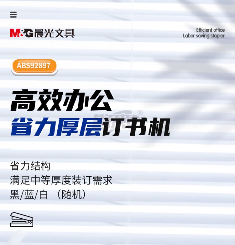 产品名称 : 晨光(M&G)文具12#厚层订书机 商务省力订书器 办公用品 单个装颜色随机ABS92897