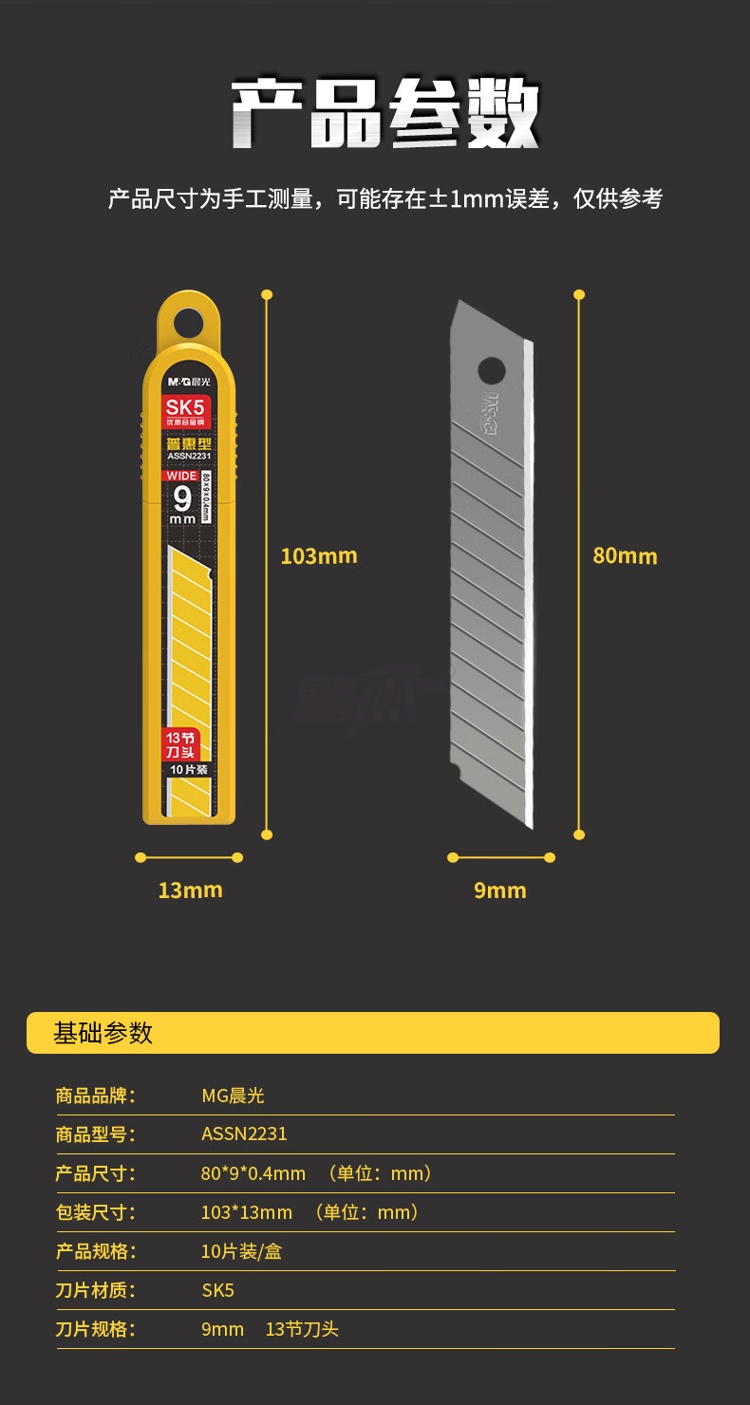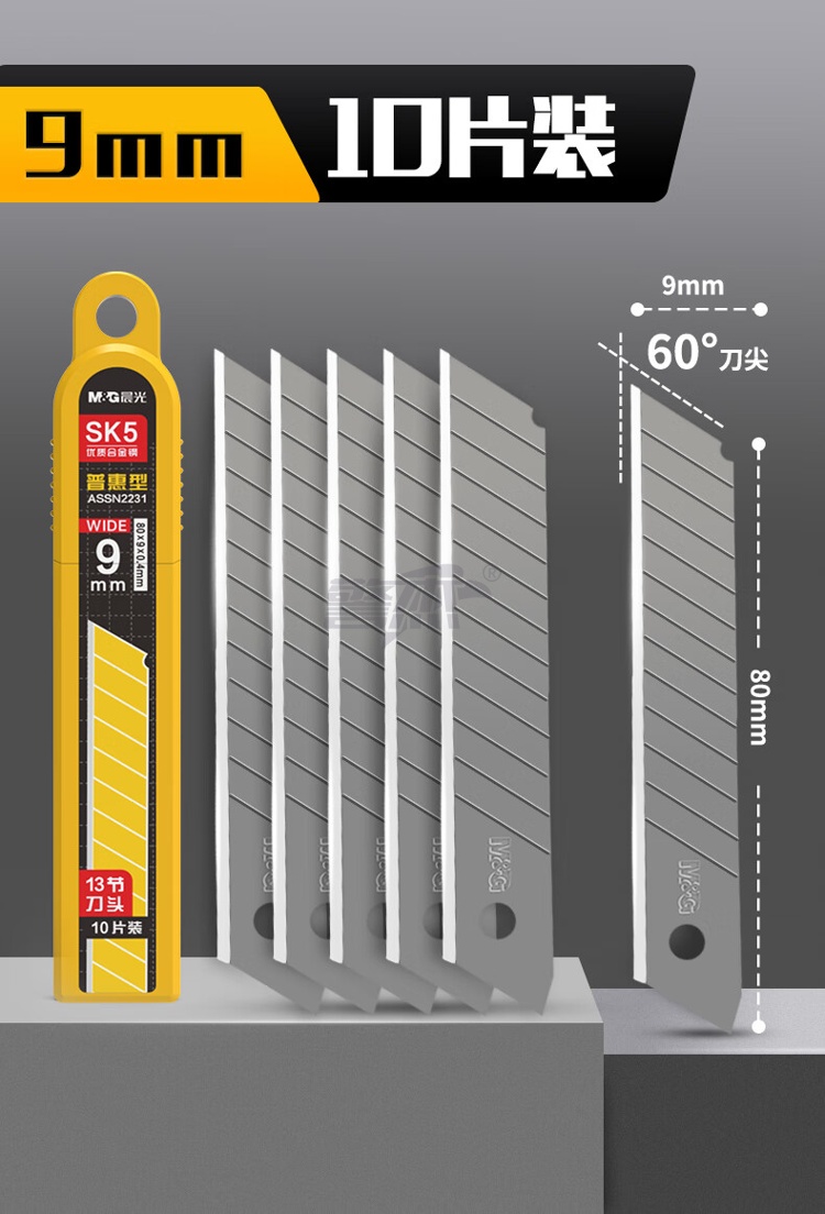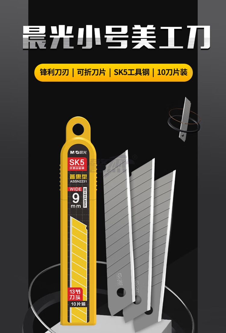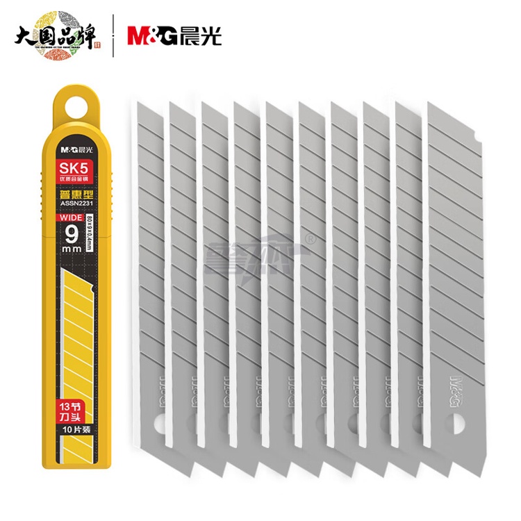 产品名称 : 晨光(M&G)文具9mm小号美工刀片 13刀头SK5合金钢刀片/替换刀片 办公用品 10片/盒 单盒装ASSN2231