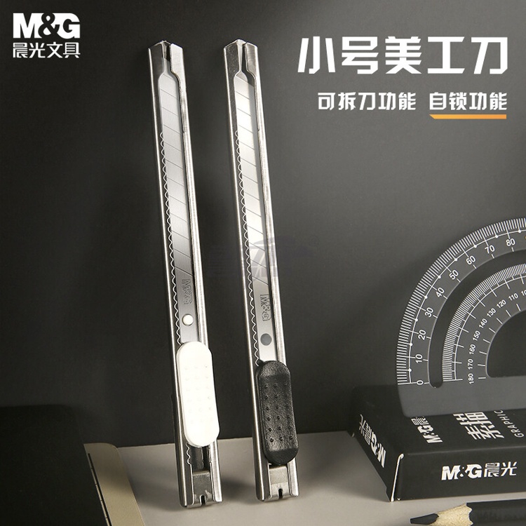 产品名称 : 晨光(M&G)文具9mm小号金属外壳美工刀 家用办公裁纸刀壁纸刀/刀子 办公用品 单把装颜色随机ASSN2239