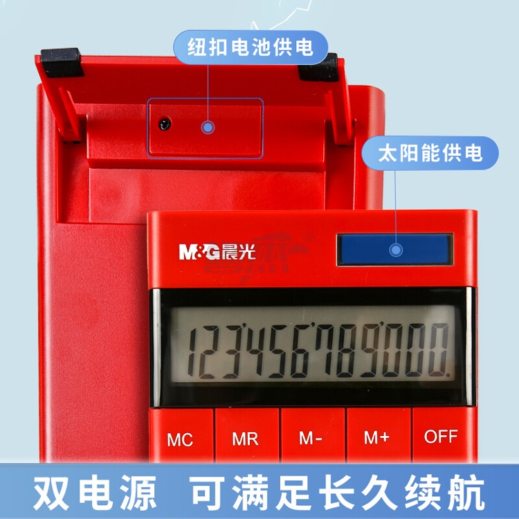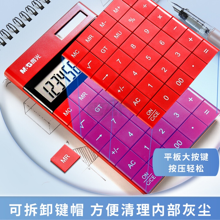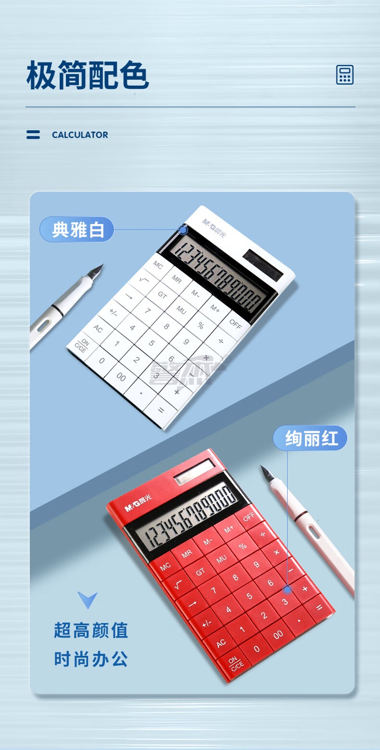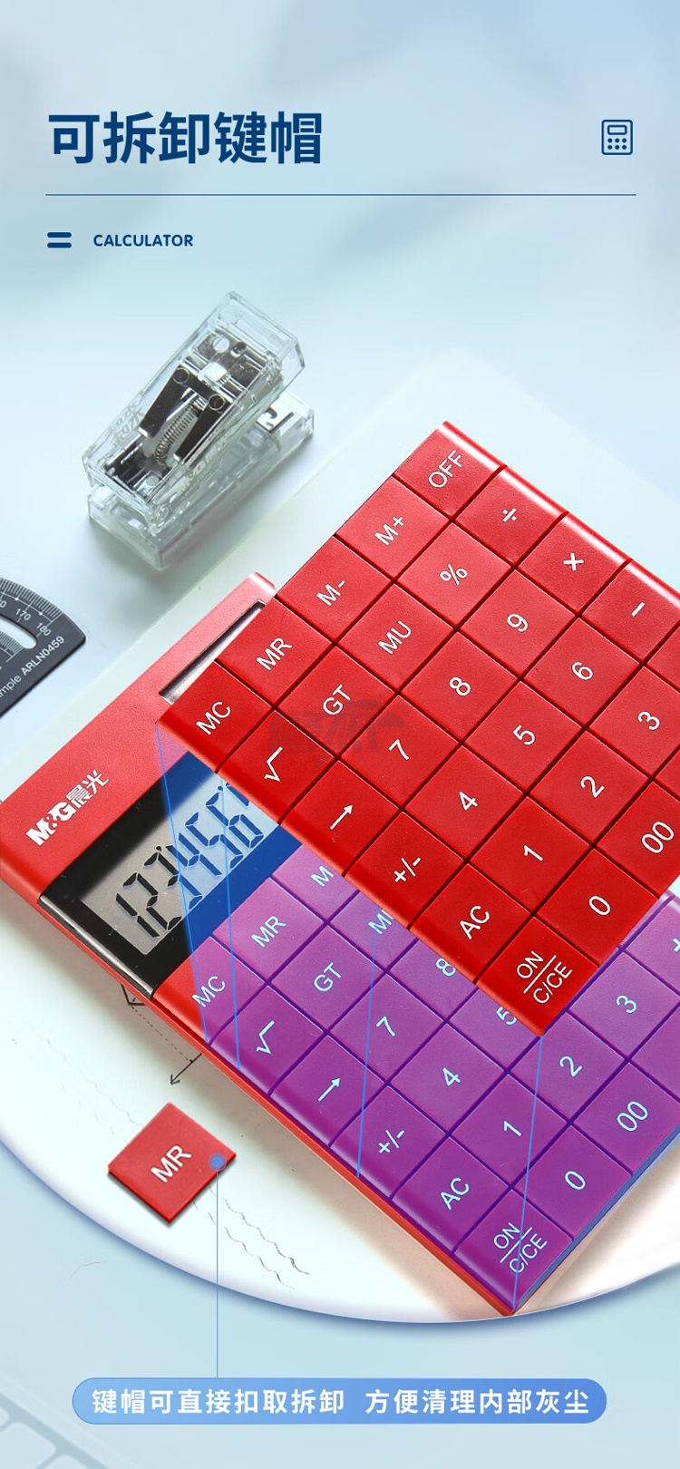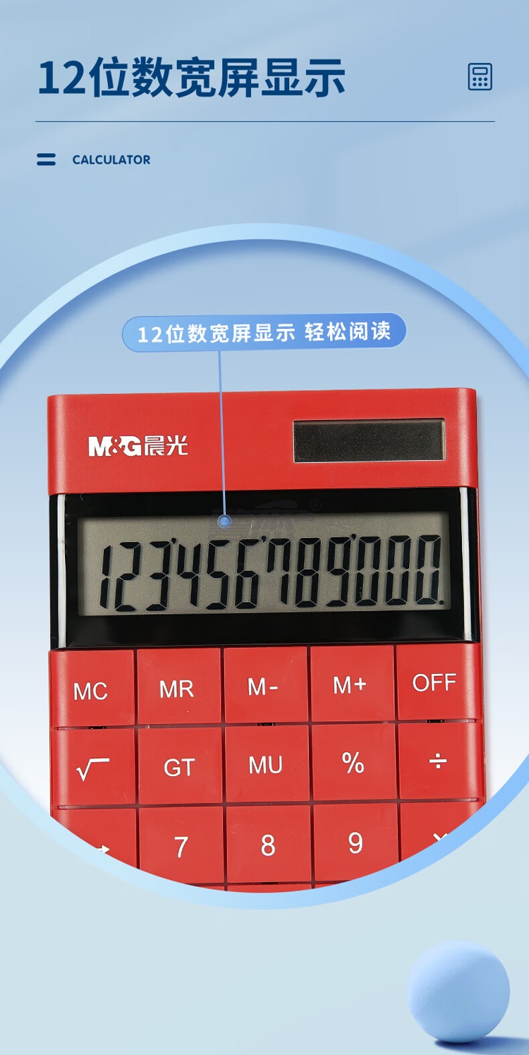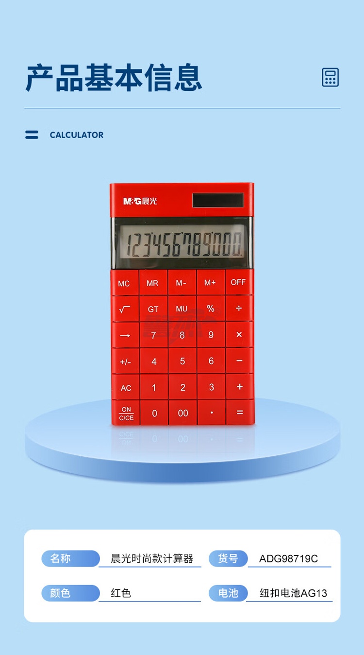 产品名称 : 晨光(M&G) 双电源无缝时尚计算器 轻薄机身平板按键桌面计算机 办公用品 红色单个装ADG98719