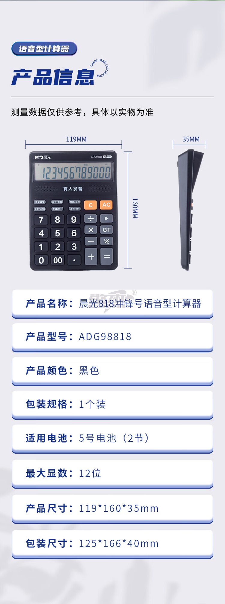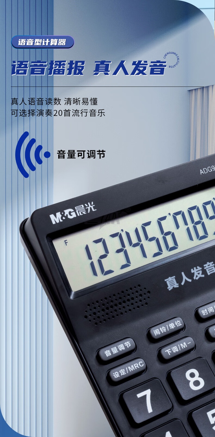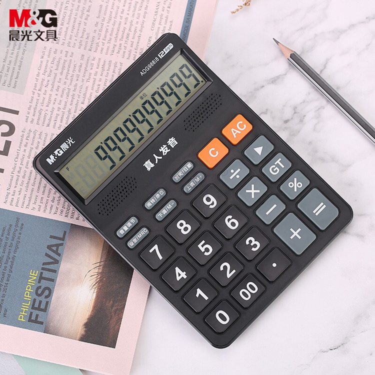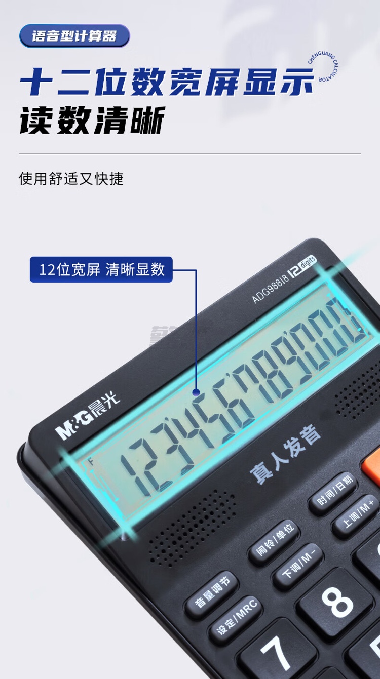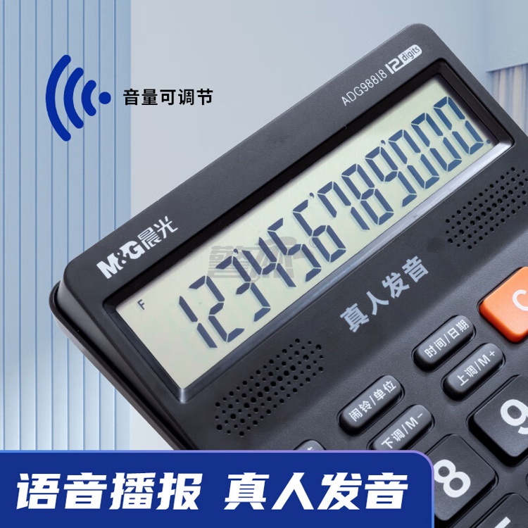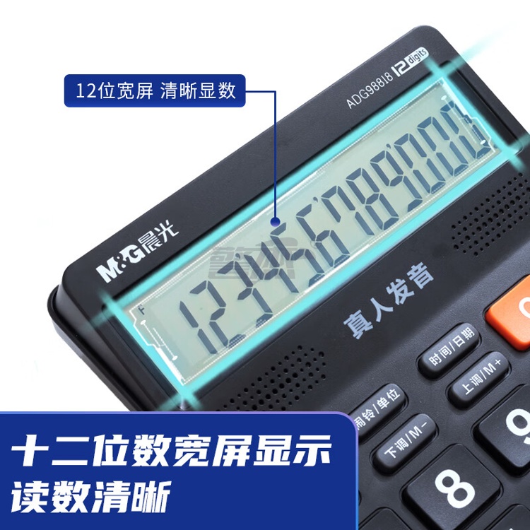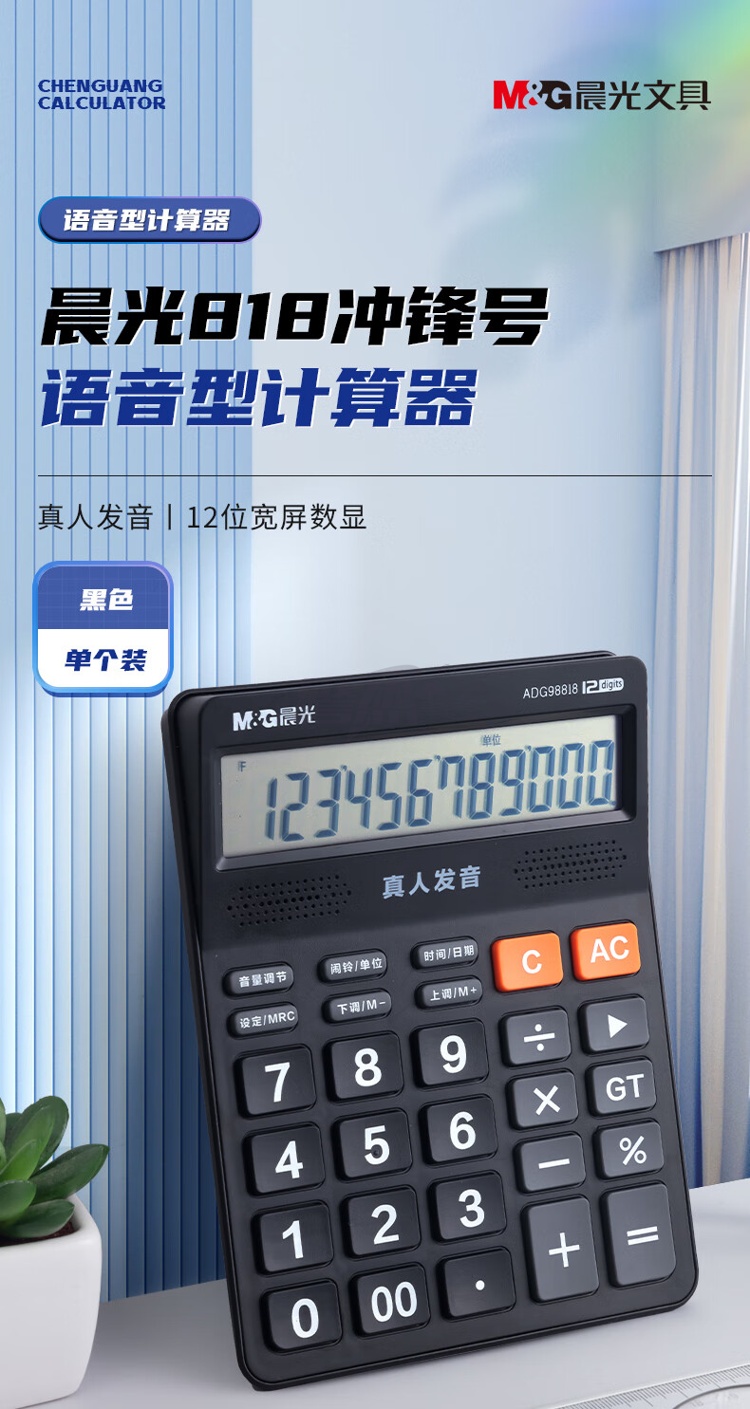 产品名称 : 晨光(M&G) 语音型计算器 818冲锋号桌面计算机 学生/办公通用12位大屏幕计算器 黑色单个装ADG98818