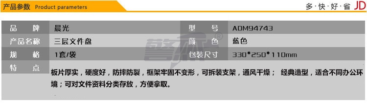 产品名称 : 晨光(M&G)文具三层镂空收纳文件座 自由拆卸组装三层文件盘/文件框 办公用品 蓝单个装ADM94743