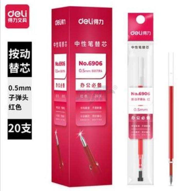 产品名称 : 得力6906中性笔芯0.5MM弹簧头(红)20支/盒