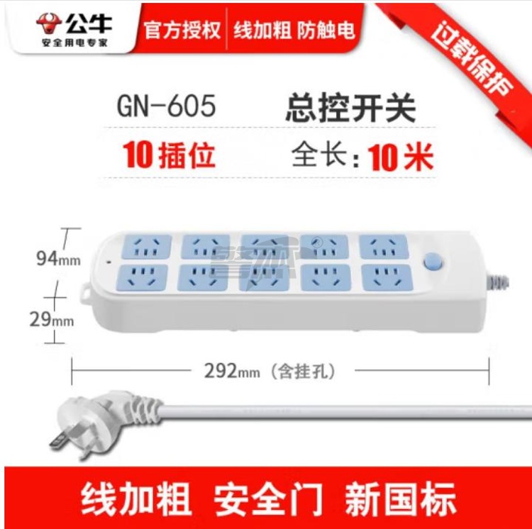 产品名称 : 公牛过载保护插座多功能插线板电源接线板插排长线拖线板超功率自动断电家用多孔排插带开关插板带线 10插位/10米605