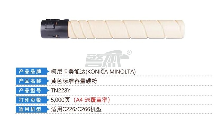 产品名称 : 柯尼卡美能达(KONICA MINOLTA)TN223Y 黄色标容墨粉盒(适用C226/C266)