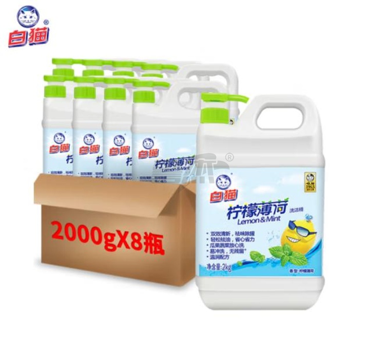 产品名称 : 白猫 柠檬薄荷洗洁精2kg*8瓶(整箱装) A类食品用祛油除腥青柠薄荷香
