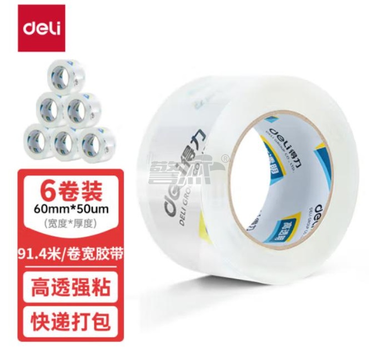 产品名称 : 得力(deli)高品质高透明封箱胶带仓库打包胶带 60mm*100y*50um(91.4m/卷) 6卷/筒 办公用品 30325