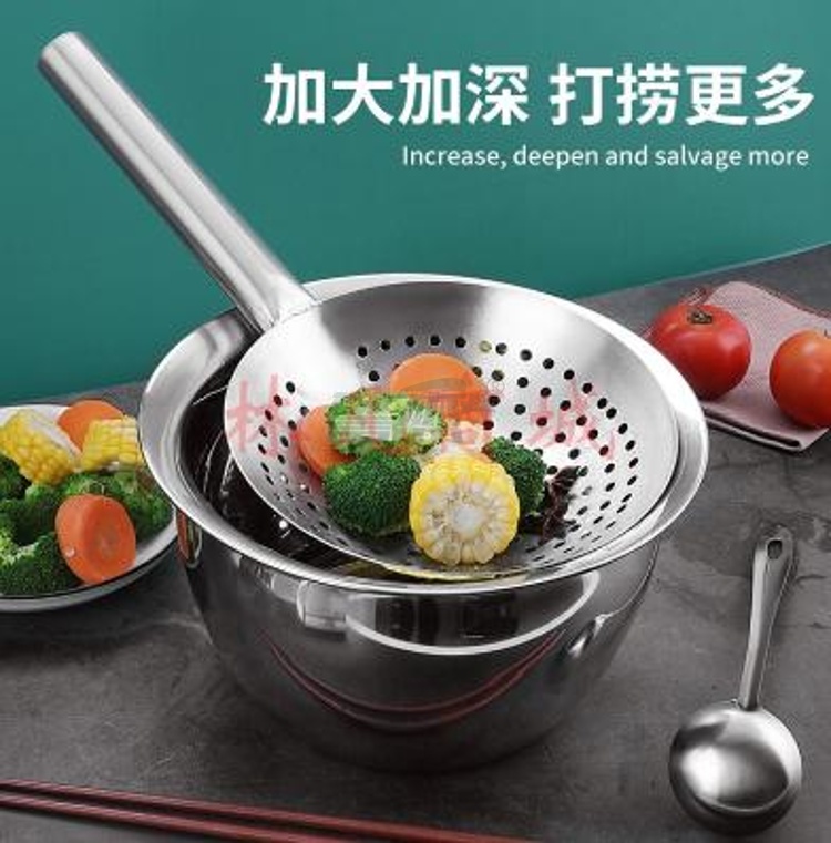 产品名称 : 特美居不锈钢漏勺油鼓笊篱圆孔油漏网勺捞饺子漏瓢焯水捞勺厨师漏勺22cm
