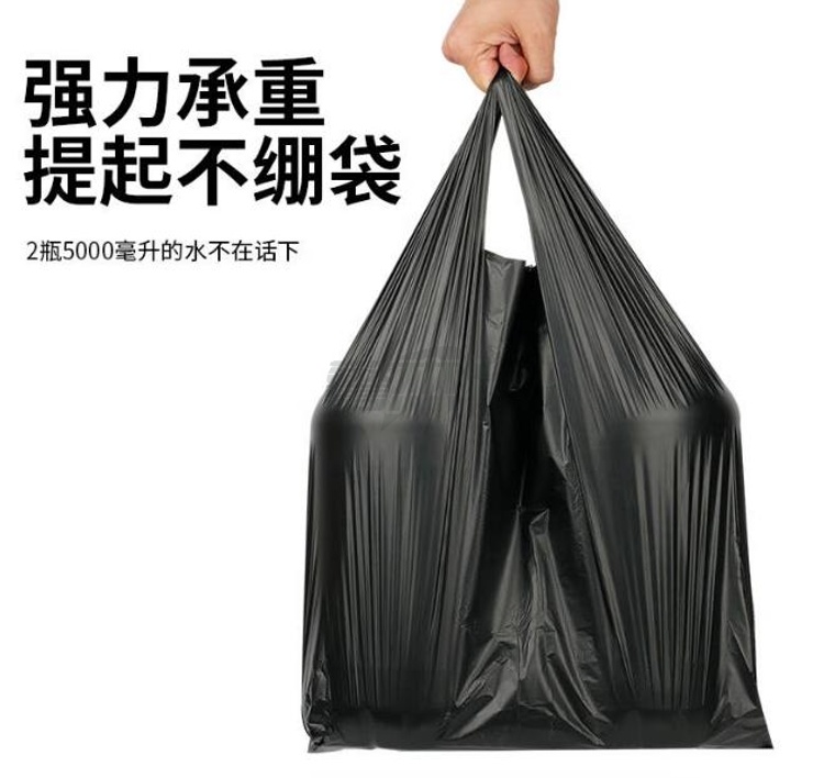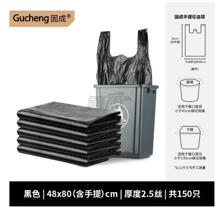 产品名称 : 固成手提垃圾袋背心式家用黑色48cm*80cm150只双面25um加厚塑料袋