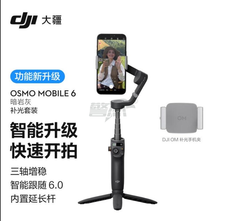产品名称 : 大疆 DJI Osmo Mobile 6 暗岩灰 OM手机云台稳定器 可折叠可伸缩自拍杆 三轴增稳防抖补光手机夹