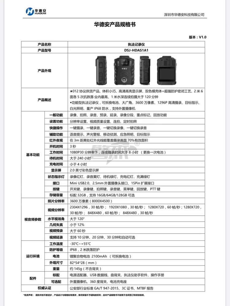 产品名称 : 华德安DSJ-HDAS1A1执法记录仪 128G 1块电池 双色模壳体+超强防护密闭工艺 1800mAh高性能可拆换电池 不断电续航
