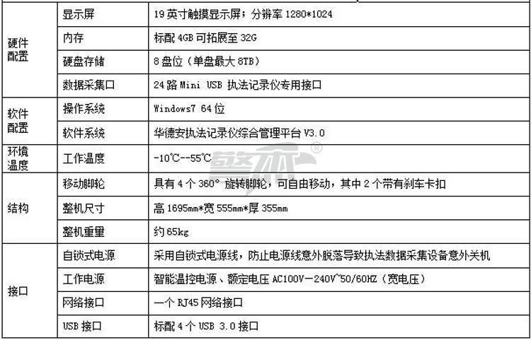 产品名称 : 华德安执法数据采集站 19英寸触摸屏;分辨率1280*1024;8盘位 24路Mini USB