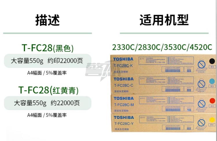 产品名称 : 东芝(TOSHIBA)T-FC28C原装碳粉墨粉盒e2330/2830/3530/4520复印机墨盒 T-FC28C-K T-FC28C-C T-FC28C-M T-FC28C-Y 四色/套