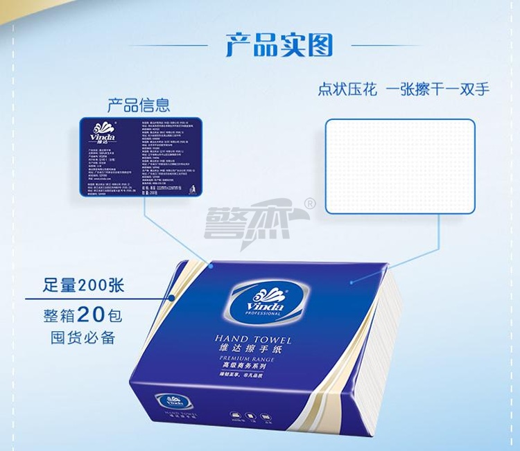 产品名称 : “Vinda/维达”VS2056 擦手纸 单箱装(200抽大规格酒店厨房餐厅卫生间222mm*226mm 20包/箱)