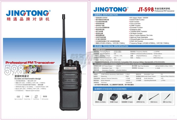 产品名称 : 精通JT-598 4800毫安电池 12W大功率超远距离传输超长时间待机对讲机
