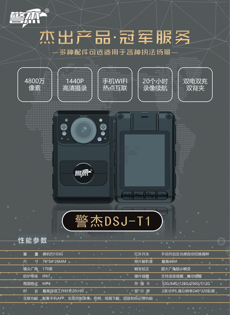 产品名称 : 警杰DSJ-T1执法视音频记录仪32G